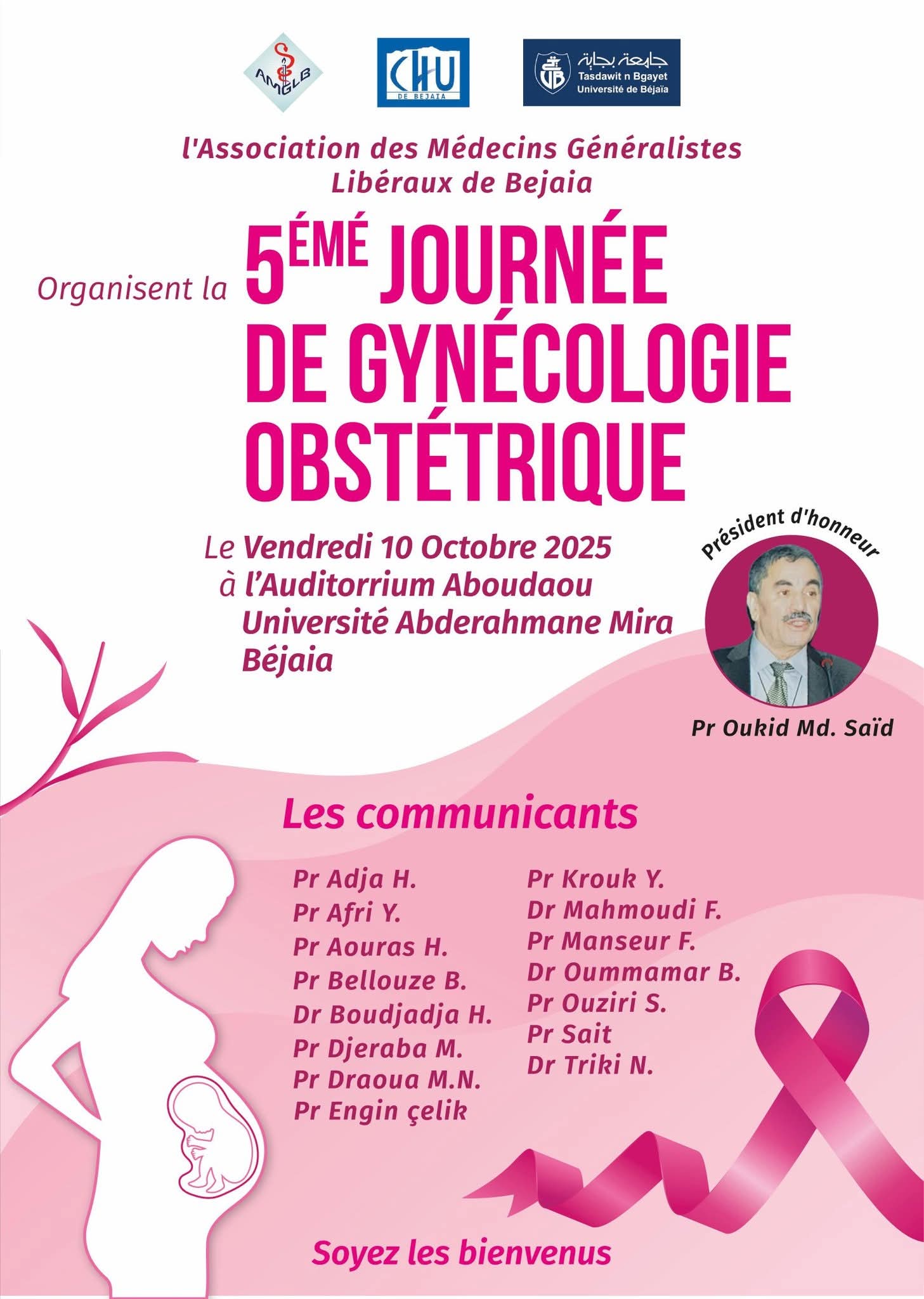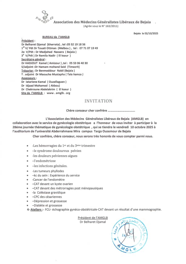 L’Association des Médecins Généralistes Libéraux de Bejaia (AMGLB) en collaboration avec le service de gynécologie obstétrique a l’honneur de vous inviter à participer à la 28 éme journée thématique de gynécologie obstétrique, qui se tiendra le vendredi 10 octobre 2025 à l’auditorium de l’université Abderrahmane Mira campus Aboudaou de Bejaia.